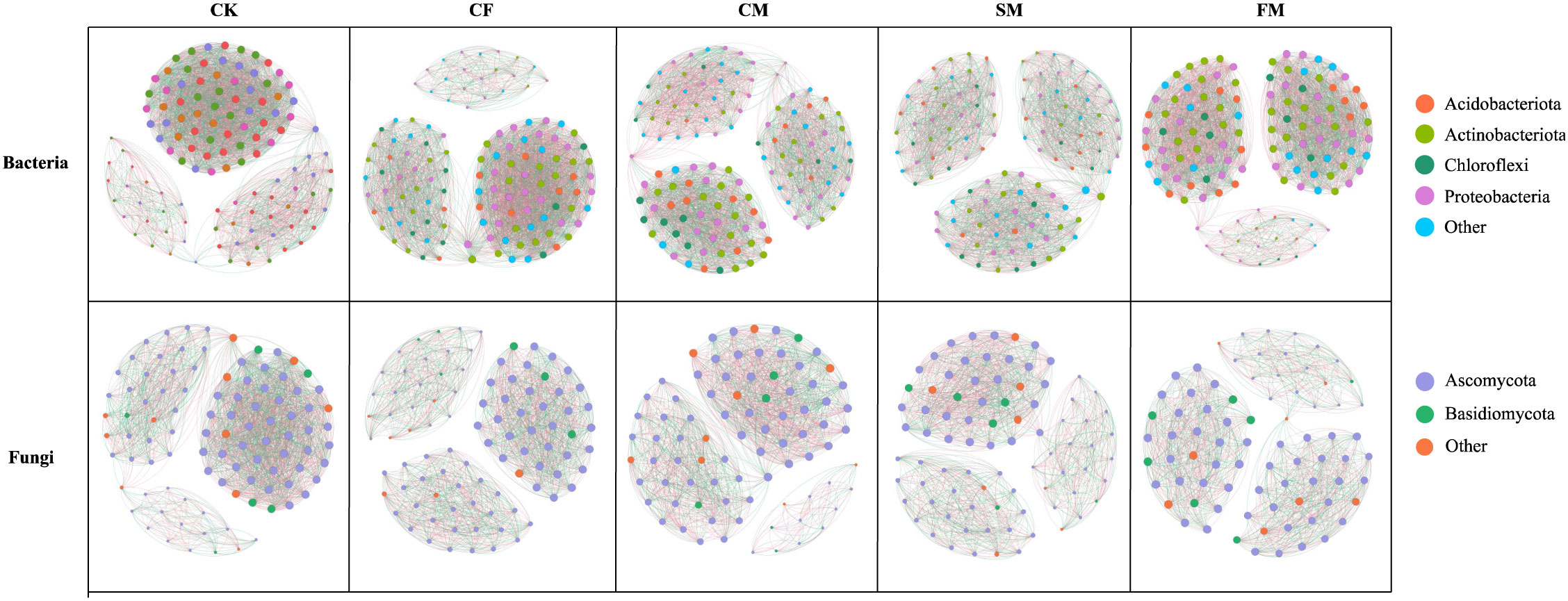 Figure 4. Co-occurrence networks constructed based on the ASV with average relative abundance of >0.09% in the soil bacterial and fungal communities.