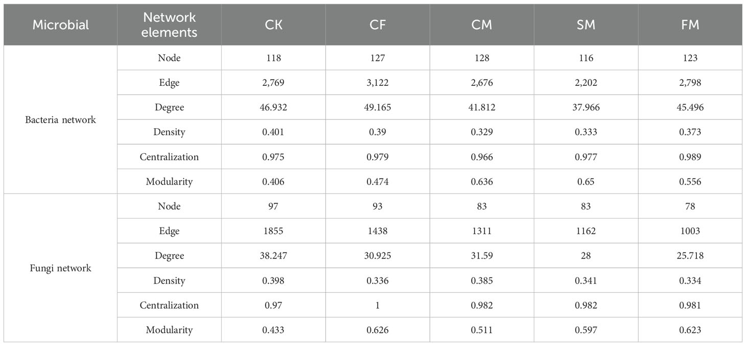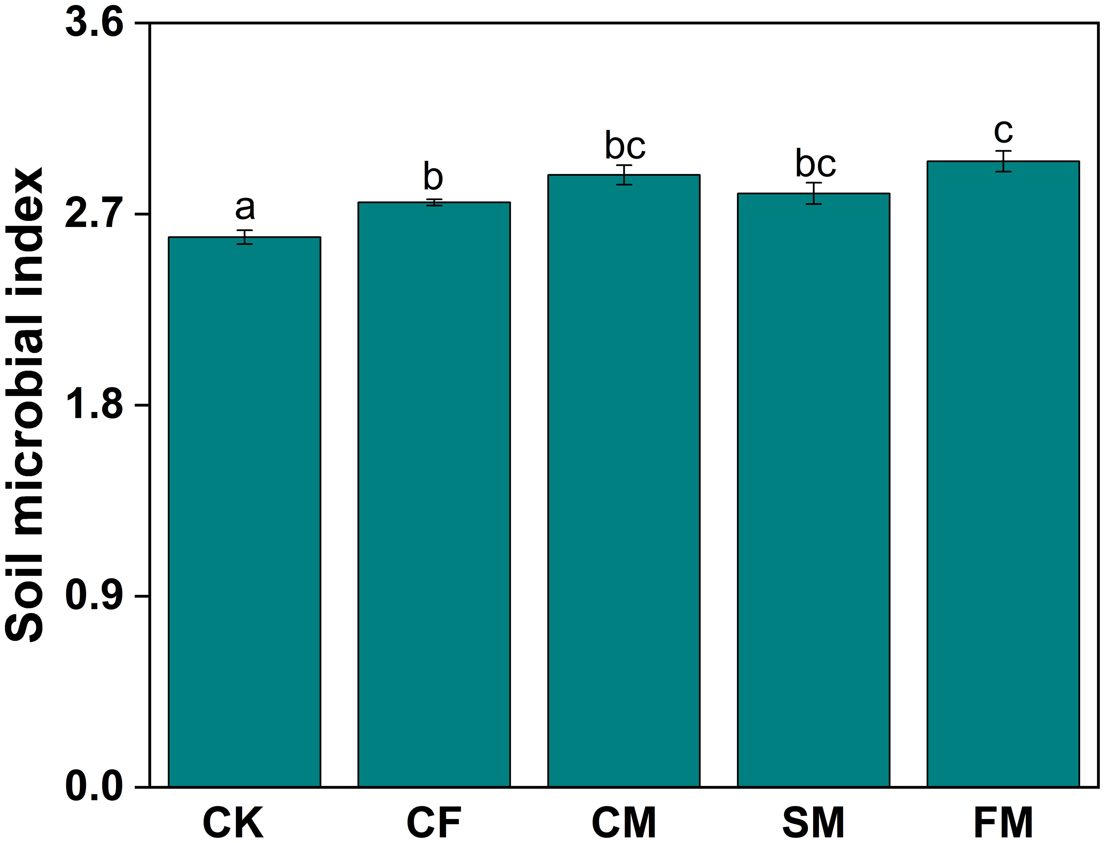 Co-occurrence networks of fungal and bacterial communities were constructed to assess the complexity and stability of soil microbial communities under different organic and inorganic fertilizer treatments (Figure 4). Compared to the CF treatment, CM and SM treatments enhanced the number of connections (edges) within the bacterial community (Table 1). Specifically, the number of nodes in the bacterial network increased by 0.79% under CM treatment compared to that under CF treatment. Additionally, the modularity of the bacterial network increased by 34.2%, 17.3%, and 37.1% under CM, SM, and FM treatments, respectively, compared to that under the CF treatment. In all fertilization treatments, the CM and SM treatments exhibited higher values for nodes, edges, degree, and modularity in the bacterial network. In contrast, the fungal network displayed a different response to the fertilizer application. Compared to the CF treatment, organic fertilizers reduced the number of nodes, edges, and degree in the fungal community. However, within the fertilization treatments, CF and CM showed relatively higher values for nodes, edges, degree, and modularity in the fungal network, suggesting a more structured and interconnected community under these fertilization practices. The CM, SM, and FM treatments increased the soil microbial index by 4.7%, 1.5%, and 7.0%, respectively, compared to the CF treatment (p < 0.05; Figure 5). Organic fertilizers can enhance the soil microbial index, with manure exhibiting the highest soil microbial index.