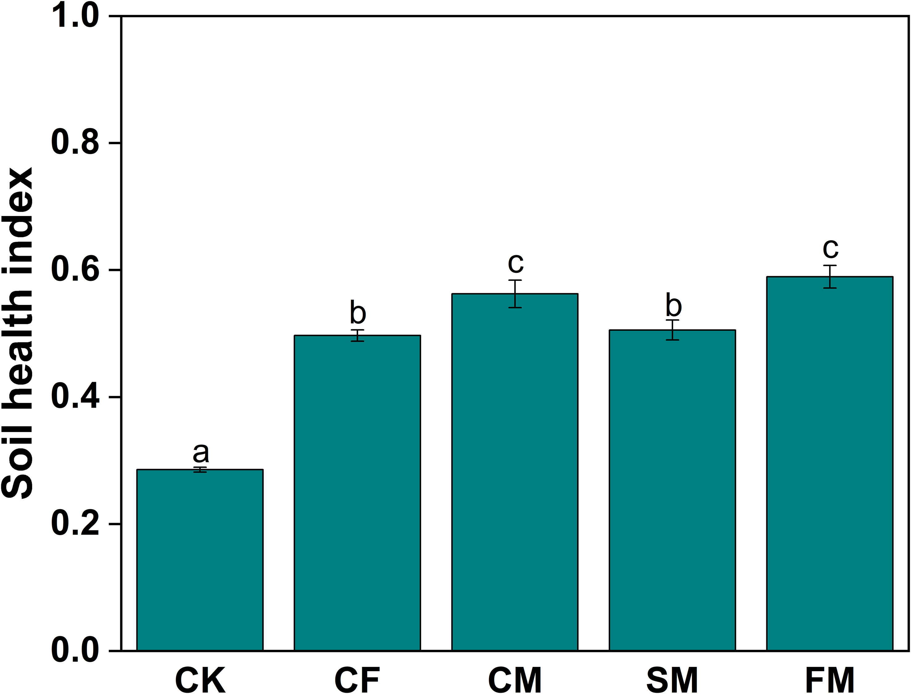 Figure 7. Soil health index under different fertilizer practices. Different lowercase letters indicate significant differences at the p < 0.05 level.