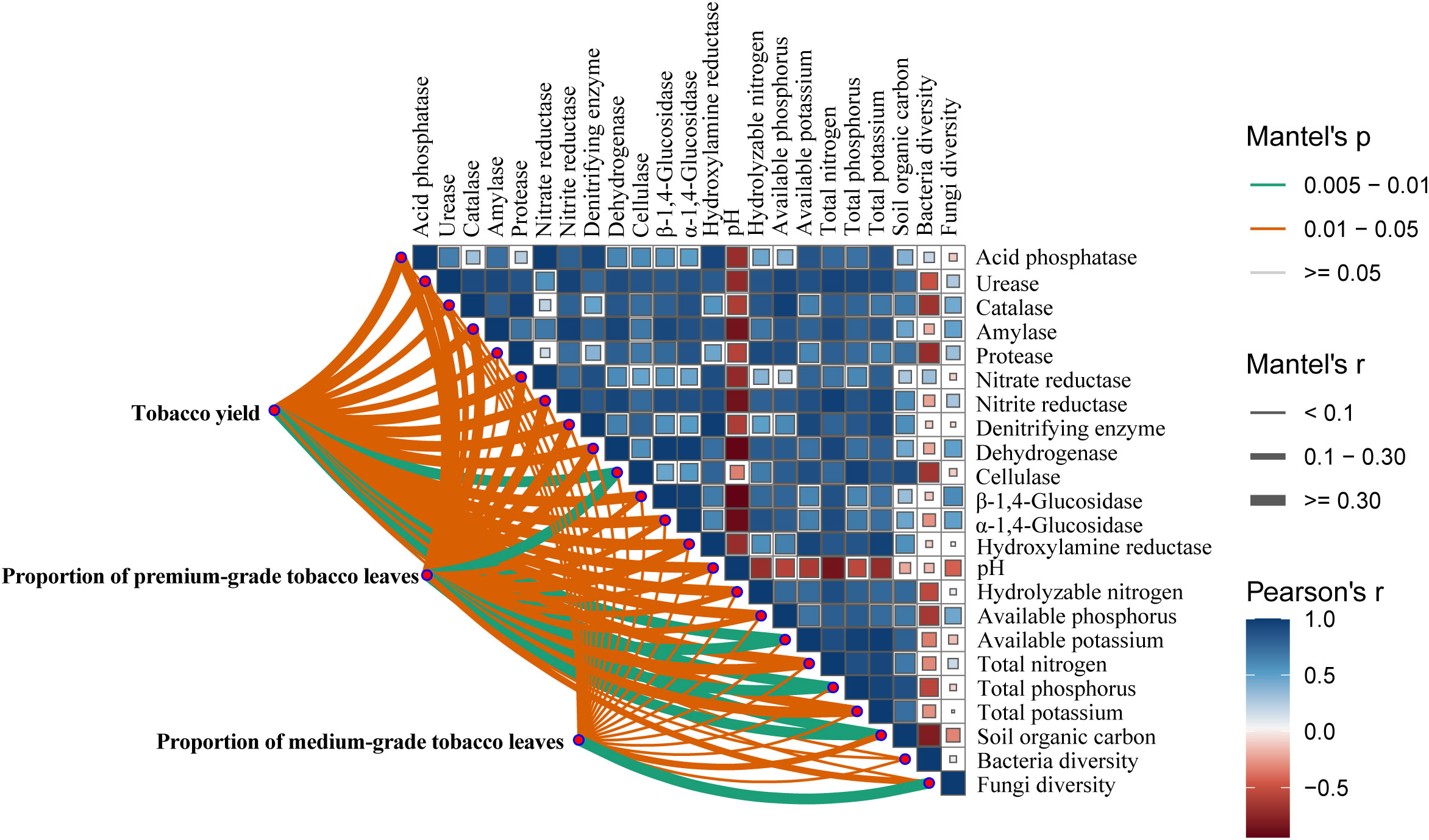 Figure 9. Relationship among soil physicochemical property, soil enzyme activity, microbial community, tobacco yield and quality. Pairwise comparisons of soil properties, enzyme activity and microbial diversity are shown, with a color gradient denoting Spearman’s correlation coefficient. The tobacco yield, superior tobacco proportion and middle tobacco proportion were related to each soil physicochemical property, enzyme activity and microbial diversity by Spearman’s correlation coefficient. Edge width corresponds to r statistic for the correlation, and edge color denotes the statistical significance.