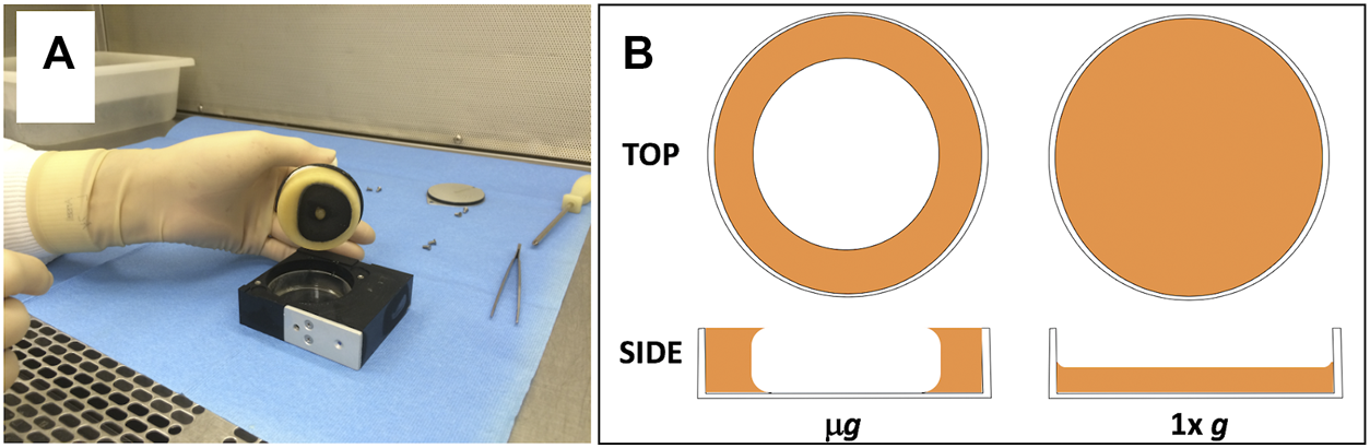 (A) Photograph showing frozen liquid culture being removed from PDFU after BRIC-21 spaceflight mission. Note toroidal-shaped culture adhering to the PDFU manifold and valve; empty 6-cm Petri dish bottom can be seen inside the PDFU chamber. (B) Schematic of differing liquid geometries of cultures in Petri dishes in microgravity (μg, left) and Earth-normal gravity (1 xg, right). Both top views and side views are shown. Side views represent a section taken from the center of each dish.