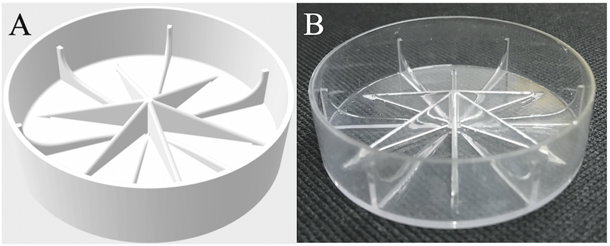 (A) Graphic representation of modified Petri dish bottom designed to mitigate microgravity effects (.STL file). (B) Actual modified dish fabricated by 3D printing and coated with polyurethane.