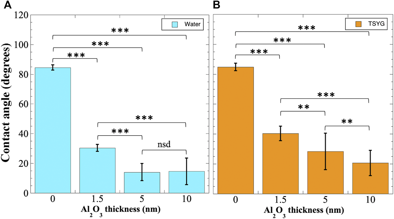 Contact angle measurements of Al2O3 coated coupons. Polyurethane-coated polycarbonate coupons were additionally coated with Al2O3 by ALD and contact angles measured using distilled water (A) or TSYG medium (B) as described in Materials and Methods. Data shown are averages ± standard deviations and were compared by ANOVA. **, p < 0.01; ***, p < 0.001; nsd, not significantly different (p > 0.05). Number of samples measured ranged from n = 14 to n = 31.