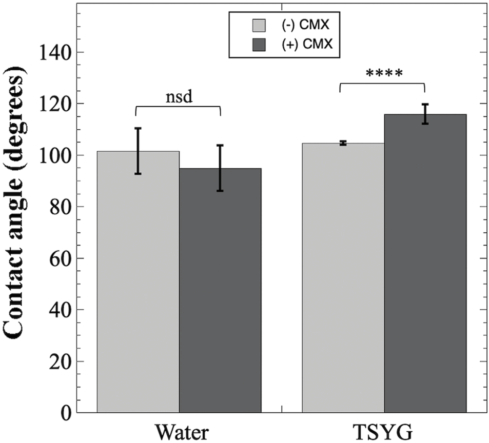 Contact angle measurements of CMX-treated aluminum coupons. Black-anodized aluminum coupons were either untreated (light gray bars) or coated with CMX ceramic automotive clear coat (dark gray bars) and contact angles measured as described in Materials and Methods. Data shown are averages and standard deviations and were compared by ANOVA. ****, p < 0.0001; nsd, not significantly different (p > 0.05). Number of samples measured ranged from n = 6 to n = 8.