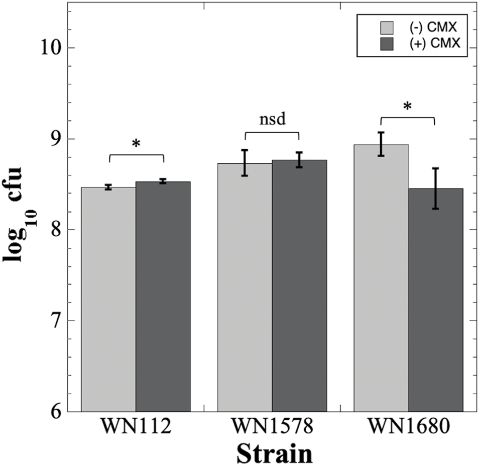 Testing CMX for biocompatibility with B. subtilis WN112 and S. aureus WN1578 and WN1680 cells. Cell titers on uncoated aluminum coupons (light gray bars) or CMX-coated coupons (dark gray bars) were determined as described in Materials and Methods and are depicted as averages ± standard deviations. *, p < 0.05; nsd, p > 0.05 (ANOVA, n = 3).