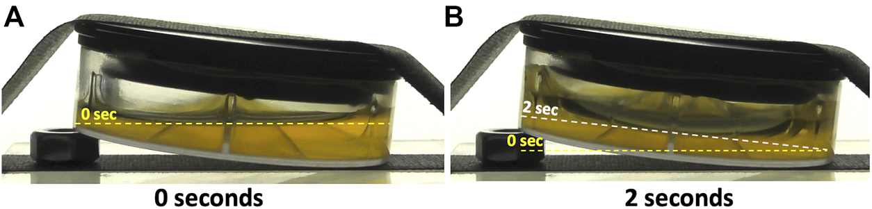 In Figure 8 we present “before” (A) and “after” (B) frames of the drop tower test of the PC + PU + Al insert, taken from Supplementary Movie 8. At 0 s, the liquid meniscus is parallel to the floor of the chamber and tilted by ∼6° with respect to the insert itself (Figure 8A). At 2 s, just prior to termination of the free-fall period, the meniscus has migrated to be parallel with the bottom of the insert and is now tilted by ∼6° with respect to the floor of the chamber (Figure 8B). Although some “creeping” of liquid up the walls of the insert is seen in lowered gravity, it is evident that the bulk of the liquid remains in the bottom of the dish (Figure 8B). These results suggest that liquid injected under microgravity conditions into the PDFU containing the PC + PU + Al insert would be encouraged, by the vane design and hydrophilic coating, to migrate into the bottom of the dish and remain there for the duration of the experiment if left undisturbed.