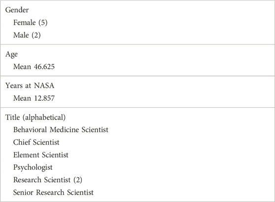 This study excluded the previously published data on the single NASA leader and includes the data from seven additional NASA leaders. Table 1 presents the demographic information of these participants.