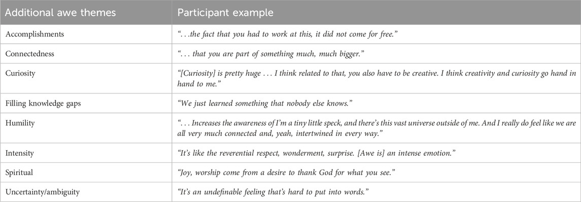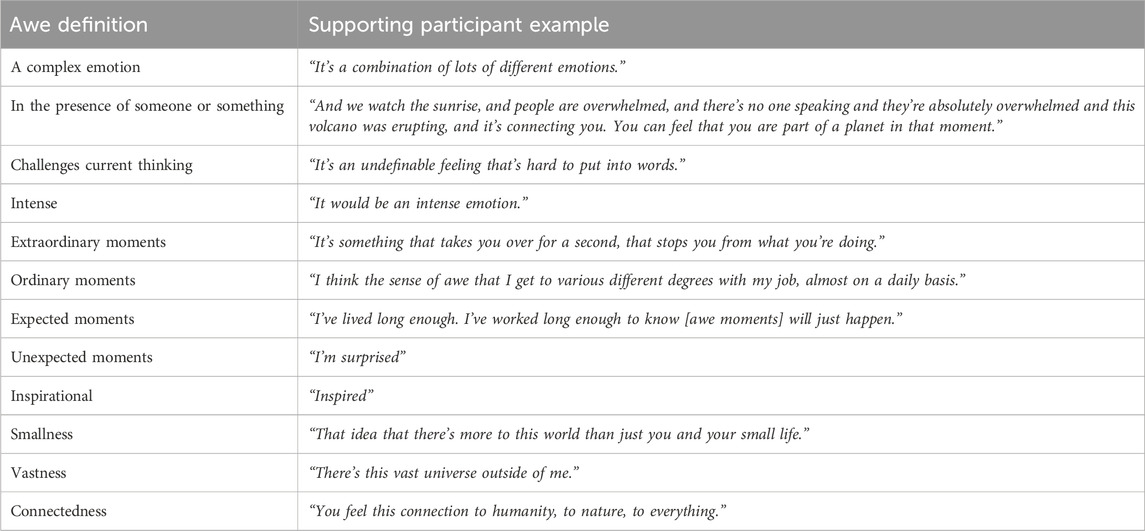 The results and discussion begin with how participants described the phenomenon of awe and the impact the awe narrative interviews had. Table 2 presents examples of how their definitions and descriptions of awe support and expanded upon the definition used in this study: awe is a complex emotion experienced in the presence of someone or something extraordinary that challenges our thinking. Awe experiences are often intense and may arise during both ordinary and extraordinary moments, whether anticipated or surprising. Awe can also be inspirational and evoke a sense of smallness, vastness, and connectedness, to others, to nature, and to the universe.