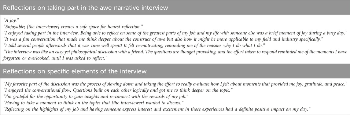 Table 3 provides an overview of the participant feedback collected via the post-interview survey, where participants shared reflections on what it was like to take part in the interview. They were also asked whether anything specific stood out to them or was particularly meaningful about participating in the interview and the overall awe-focused study.