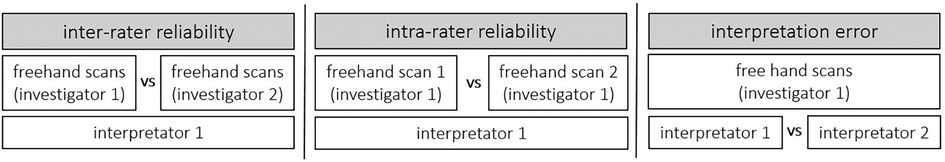 A single-group study design was conducted to examine inter-rater and intraday intra-rater reliability as well as inter-rater interpretation error of sonographic examinations evaluating skeletal muscle architecture and tissue organization. To determine inter-rater reliability of ultrasound assessment, all participants were examined by two investigators independently (investigator 1 vs. investigator 2; Figure 1). Both investigators held the probe manually at the predefined location (for more details see below). Both Investigators have several weeks/month of experience with sonographic assessments. According to König et al. (17), investigators with only several weeks/month of experience can assess muscle architecture with good to high reliability. To allow intraday intra-rater reliability assessment, all participants were measured twice by the same investigator (investigator 1: measurement 1 vs. measurement 2; Figure 1). To assess inter-rater interpretation error, ultrasound scans were interpreted twice (same image: interpretator 1 vs. interpretator 2; Figure 1).