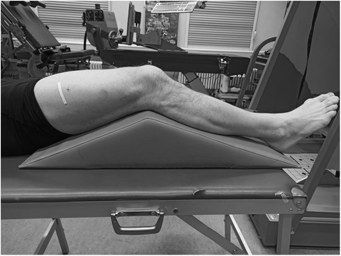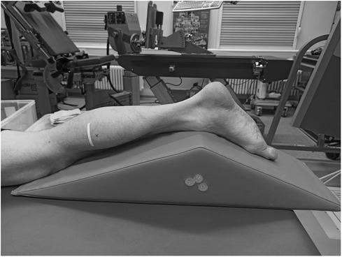 At the beginning of the testing session, anthropometric and body composition tests were performed under strictly standardized conditions. Body composition was analyzed with the InBody720 (Biospace; Seoul, South Korea). Afterwards the participants laid prone on an examination table with the right leg supported on an inclined foam wedge (ankle 40° of plantar flexion; Figure 2) to assess the right GM muscle. For assessing the right VL muscle, participants laid supine on an examination table with the right leg supported on an inclined foam wedge (knee 25° flexed; Figure 3) to avoid tension in the VL muscle. The knee and ankle joint angles were consistent within each subject during repeated measurements because the wedge was consistently placed in the same position. GM and VL were assessed under resting condition. Longitudinal ultrasound scans (Vivid q; GE Healthcare, Tirat Carmel, Israel) of the GM and VL muscle belly were conducted with a 7.5-MHz linear ultrasound array (6 cm, 4–13 MHz). The preset was standardized (frequency: 11 MHz; depth: 4.5 cm; gain: 38%; dynamic range: 102; foci for GM: 1.2 cm and 2.5 cm, foci for VL: 1.625 cm and 3.125 cm) and kept constant for all image acquisitions. Care was taken to apply minimal pressure on the probe to prevent compression of the muscle.