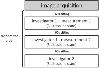 After image acquisitions were completed from one investigator, the participant sat on the exam table for 60 s (15), before laying back down to be measured again by the same investigator (measurement 2) or the second investigator, respectively. The measurements were performed in randomized order (Figure 4). For each condition, 3 scans of the GM and VL muscle were conducted at the same location, resulting in a total of 117 images for each muscle.