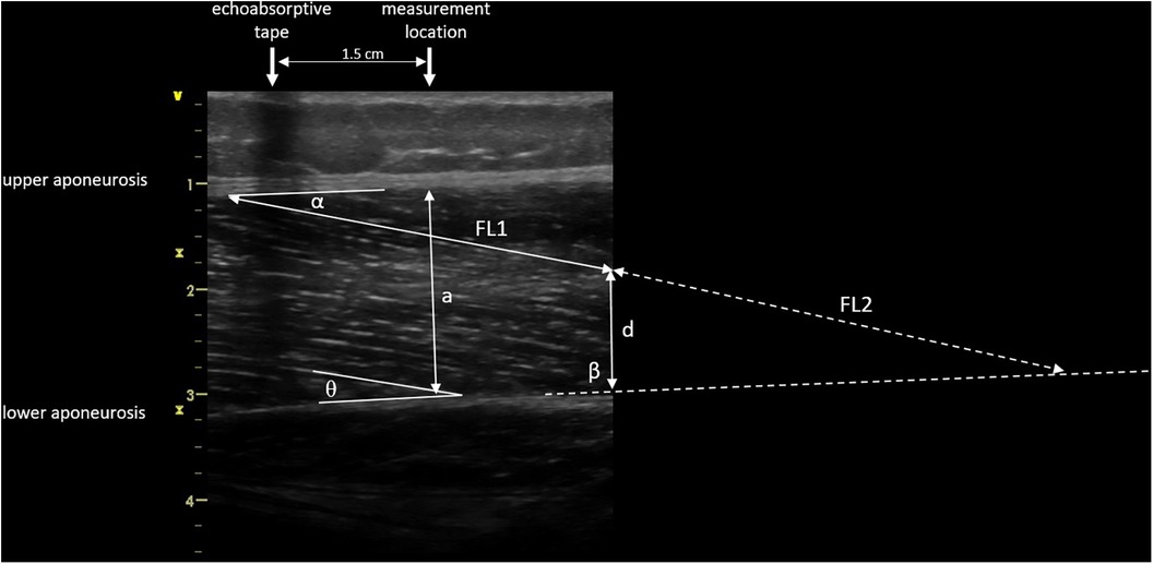 Figure 5. Muscle architecture parameters: muscle thickness 1.5 cm distal from echoabsorptive tape (a), fascicle length (visible length (FL1) + calculated length (FL2) as described by Baudry et al. (21)), superior pennation angle (α), inferior pennation angle (θ), angle between the inferior aponeurosis and the image boarder (β), and height between the inferior aponeurosis and the most distal part of the fascicle in the field of view (d).