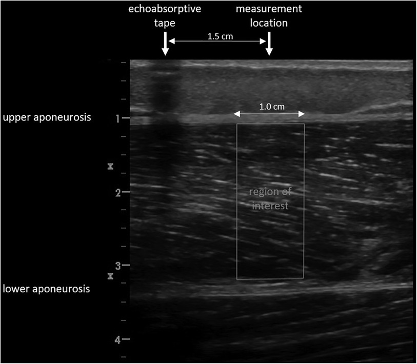describe the spread; here () are the variances of the Gaussian in the u- and v- directions respectively, and θ is the rotation of the Gaussian ellipsoid. The spectral data was fit to the ellipsoidal Gaussian using an unconstrained multivariable simplex method (22). Spatial frequency parameters, including four new parameters (Table 2), were extracted from the model after fitting was achieved. The kernel dimensions (number of pixels) was set the same as Bashford et al. (11) as the structures under analysis were at similar image depths and similar ROI sizes. A standardized ROI was selected by measuring a 1 cm wide rectangular area of the GM and VL from the upper to the lower aponeuroses at the muscle belly, at a predefined position located such that the center of the ROI was 1.5 cm from the echoabsorptive tape; i.e., the vertical edges of the ROI were 1 cm and 2 cm distal from the echoabsorptive tape (Figure 6). The SFA analysis yielded six spatial frequency parameters: peak spatial frequency radius [PSFR], peak −6 dB width [P6], PSFR/P6 [Q6], normalized peak value of amplitude spectrum [Amax], power within peak [PWP], and peak power percent [PPP] (Table 2).