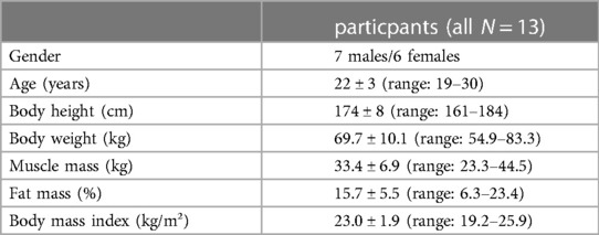 Thirteen healthy young, physically active adults (i.e., sport students) aged 19 to 30 years volunteered to participate in this study (Table 1). Exclusion criteria were defined a priori as any musculoskeletal, neurological, and/or orthopedic disorders in the lower extremities that occurred within the last six months prior to the start of the study. Written informed consent was obtained from all participants before study inclusion. The study was approved by the local ethics committee. All experiments were conducted according to the latest version of the declaration of Helsinki (18).