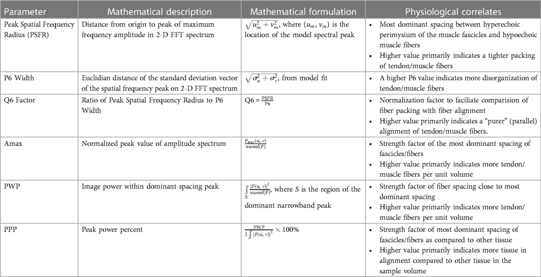 To analyze tissue organization, all ultrasound images were imported into MATLAB (Mathworks, USA R2016a) to conduct the SFA described by Bashford et al. (11). The SFA is a quantitative ultrasound method, which analyzes the anisotropic B-mode speckle pattern arising from within a tissue type in the spatial frequency domain. Briefly, a polygonal region of interest (ROI) is manually drawn in an image, and within this ROI, smaller sub-regions termed “kernels” are analyzed in the spatial frequency domain. For each kernel that fits within the ROI, parameters extracted from the FFT-derived spatial frequency spectral estimate are extracted. The parameters may be used for statistical comparisons such as classification. This method was recently updated by Bashford (unpublished work, 2023). In the previous method, the maximum value within each spatial spectrum was used to identify a spectral region of interest. In the new method, each spectral estimate F(u,v) is modelled as a two-dimensional narrowband spatial signal with a dominant spatial peak consisting of an elliptical Gaussian: