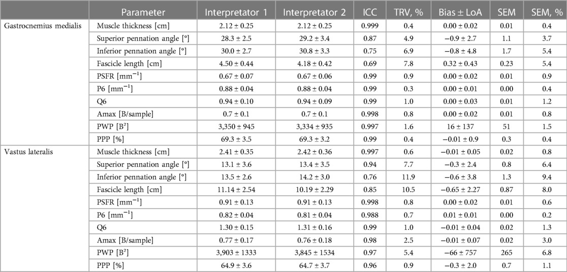 Methods: The GM and VL of 13 healthy adults (22 ± 3 years) were examined thrice with sagittal B-mode ultrasound: intraday test-retest examination by one investigator (intra-rater) and separate examinations by two investigators (inter-rater). Additionally, images from one investigator were analysed by two interpretators (interpretation error). Muscle architecture was assessed by muscle thickness [MT], fascicle length [FL], as well as superior and inferior pennation angle [PA]. Muscle tissue organization was determined by spatial frequency analysis (SFA: peak spatial frequency radius, peak −6 dB width, PSFR/P6, normalized peak value of amplitude spectrum [Amax], power within peak [PWP], peak power percent). Reliability of ultrasound examination and image interpretation are presented as intraclass correlation coefficient (ICC), test-retest variability, standard error of measurement as well as bias and limits of agreement.