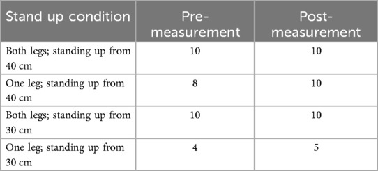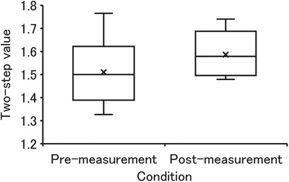 In the physical capabilities test, four subjects were unable to participate in the measurements for personal reasons. Figure 4 shows the two-step value in pre- and post-measurements. The medians (Mdn) tended to increase between pre- (Mdn = 1.50) and post-measurements (Mdn = 1.58), with no significant difference identified (Z = 1.602, p = 0.109). The effect size was large (r = 0.507). As shown in Table 2, all subjects successfully stood up on both legs in all measurements. The number of subjects who successfully stood up at 40 cm increased from eight to ten, and at 30 cm, it increased from four to five.