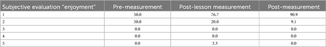 The average value of subjective fatigue after the lessons was 16.4 ± 2.1, indicating an exercise intensity equivalent to “hard” to “very, very hard” (42). Response ratio (%) of subjective evaluations of “enjoyment,” “motivation for initiation of PA,” and “motivation for continuation of PA” through the use of our device are shown in Tables 4–6 respectively. Most subjects indicated scores of 1, indicating “enjoyable,” for subjective evaluations of “enjoyment,” with an increase in the number of times. Similarly, many indicated scores of 1, indicating effectiveness in initiating and continuing PA, for subjective evaluations of “motivation for initiation of PA” and “motivation for continuation of PA,” with an increase in the number of times.