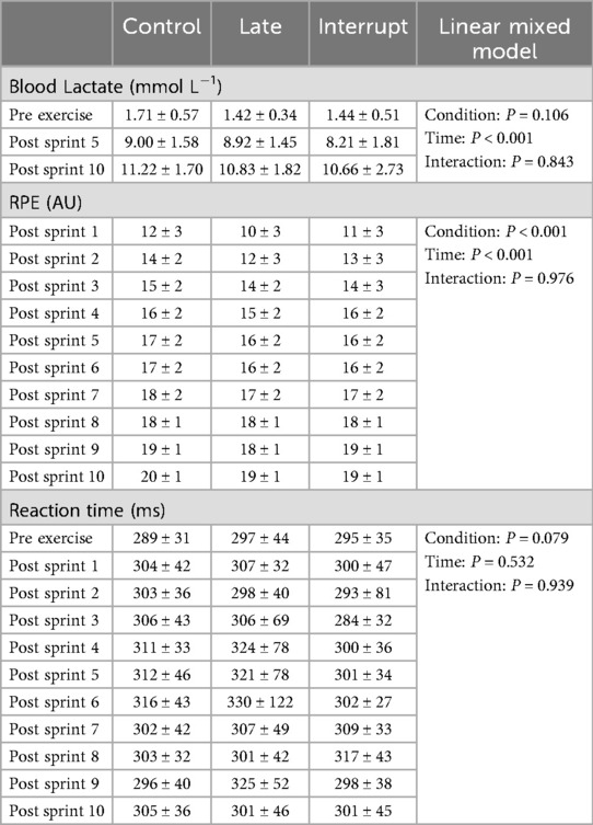 Blood lactate, RPE and reaction time responses to the repeated sprint cycling protocol are presented in Table 1. There was no effect of condition (P = 0.106), or condition by sprint interaction (P = 0.843), for blood lactate. A main effect of condition (P < 0.001) was observed for RPE. Compared to Control, RPE was always lower in Late (MD −1 AU, 95% CI −2 to −1, P < 0.001) and Interrupt (MD −1 AU, 95% CI −1 to 0, P < 0.001). RPE was also lower in Late compared to Interrupt (MD −1 AU, 95% CI −1 to 0, P < 0.001). There was no condition by sprint number interaction (P = 0.976).