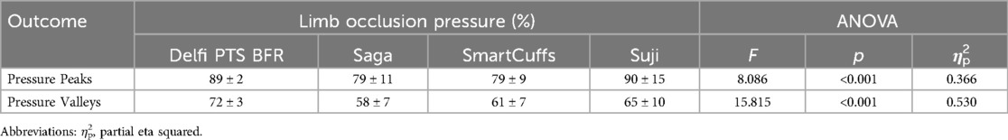 The Statistical Package for Social Sciences (Version 29.0.1.0, IBM Corp, Chicago, Illinois) was used for statistical analysis. No a priori sample size calculation was performed in the original study. However, a sample size of n = 15 is sufficient to detect effect sizes ranging from moderate to large (Cohen's f = 0.25–0.40) in a within-subjects (repeated-measures) ANOVA design, assuming a typical correlation among repeated measures (r = 0.5). Statistical significance was set a priori at p < 0.05. The Friedman Test compared differences in the percentage of time tourniquet cuff pressure was within specific windows of the target pressure (±2.5%, ±5%, ±10%, ±15%, and ±20%) between BFR devices as this data did not conform to a normal distribution. Significant main effects were further examined using simple post-hoc pairwise comparisons using Wilcoxon signed-rank tests with adjusted p-values (Bonferroni method). Non-parametric data are presented using the median and interquartile range (IQR). A one-way repeated measures analysis of variance (ANOVA) compared differences in the mean tourniquet cuff pressure peaks and valleys, and pressure drifts across the BFR application period between each BFR device. Data were verified for normality (Shapiro–Wilks test and skewness and kurtosis) and sphericity (Mauchly's Test of Sphericity). Simple post-hoc pairwise comparisons were examined with Bonferroni adjustments. Effect sizes were computed using partial eta squared (ηp2). Data are presented as mean ± standard deviation unless otherwise specified.