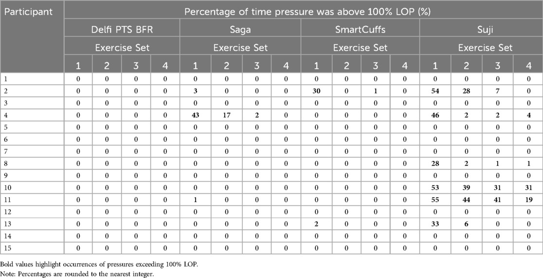 Table 3 displays the percentage of time tourniquet cuff pressure exceeded 100% LOP for each BFR device and participant. Figure 3 illustrates tourniquet cuff pressure exceeding LOP. Tourniquet cuff pressures >100% LOP were variable between BFR devices and participants. Only the Delfi PTS for BFR was found to not have tourniquet cuff pressures >100% LOP for any participant.