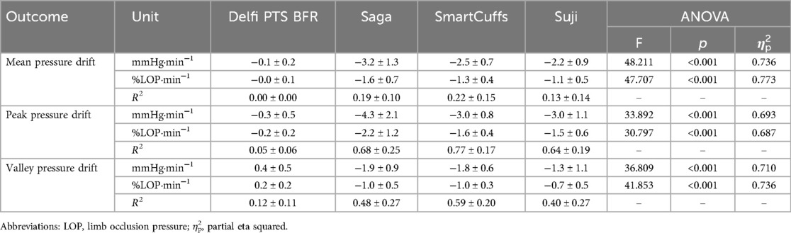 Tourniquet cuff pressure peaks declined by ∼2–4 mmHg·min−1 (∼1%–2% LOP·min−1) across the BFR application period within the Saga, SmartCuffs, and Suji BFR devices. Tourniquet cuff pressure valleys declined by ∼1–2 mmHg·min−1 (∼1% LOP·min−1) across the BFR application period for the same BFR devices. The relationship between tourniquet cuff pressure peaks and valleys with respect to time was moderate-to-strong (R2 = 0.64–0.77) and weak-to-moderate (R2 = 0.40–0.59), respectively, in these BFR devices. The Delfi PTS for BFR exhibited trivial drifts in pressure peaks and valleys that had no relation with BFR application time (R2 ≤ 0.12). Individual data and pairwise comparisons can be found in the Supplementary Excel File (sheet: “Drift %LOP” and “Drift mmHg”).