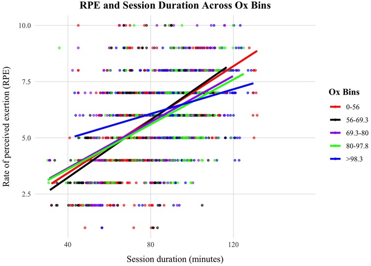 Post analysis, we investigated whether an acclimation effect existed in the variables impacted by air pollution (i.e., RPE). Recent exposure to higher O3 levels has been shown to reduce the negative effects of acute exposure of O3 on the competitive performances of intercollegiate track and field athletes (30). In accordance with the methods of this paper (30), a seven-session rolling average of O3 was created. The rolling O3 was then combined with the hourly NO2 to create the variable “Rolling Ox”. To explore whether the magnitude of a negative effect on performance is different between low or high recent exposures to O3 levels in the time leading up to the competition, Rolling Ox was binned into five exposure levels with approximately equal number of observations (see Table 2). Then, two linear models for RPE were run with all predictor variables included. The only difference between the two models was the inclusion of either the acute exposure of Ox (i.e., no acclimation effect accounted for) or the seven-day rolling average of Ox (i.e., accounting for a possible acclimation effect; see section 3.2.9). Data for model A are visualised in Figure 1.