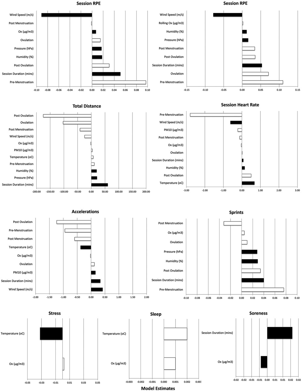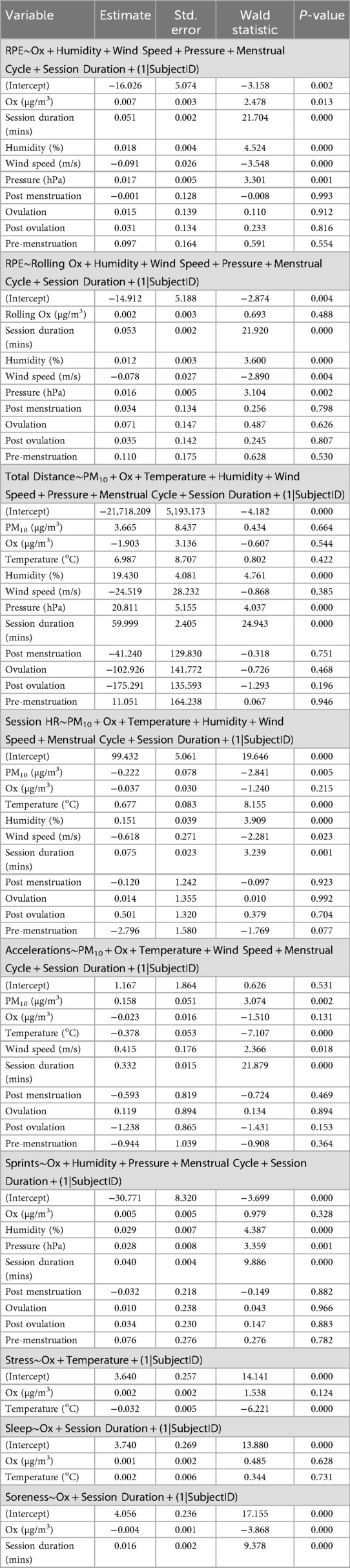 Methods: Comprehensive data on external, internal, and subjective load variables were combined with the concentrations of three major air pollutants (Particulate Matter >10 µm and Oxidant (Ox = Ozone + Nitrogen Dioxide) during soccer training and matches in the 2022–23 season. Linear mixed-effects models assessed performance parameters such as distance ran, heart rate, rating of perceived exertion (RPE), accounting for confounding factors such as weather and menstrual cycle phase.