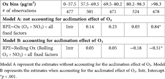 Table 2 demonstrates that accounting for the recent exposure of O3 leading up to the session of interest effectively reversed the significant negative impact of O3 on RPE in the highest pollutant bin.