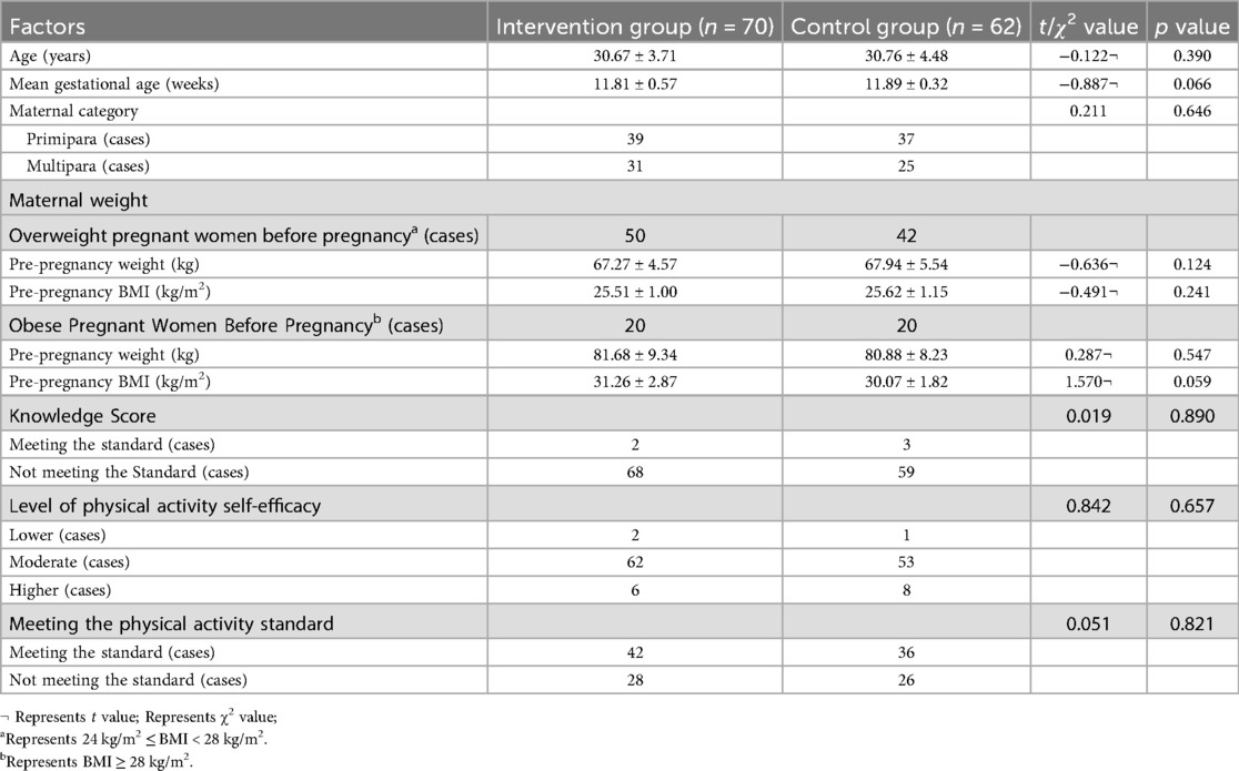 A convenience sampling method was used to select pregnant women who registered for maternity care and underwent routine prenatal check-ups at the obstetric outpatient department of a tertiary maternal and child health hospital in Zhengzhou in February 2022 to April 2023. These women were followed up until 36+6 weeks of gestation. Eligible overweight or obese pregnant women were identified as study participants and enrolled between 5 and 12+6 weeks of gestation. They were randomly assigned to either the intervention group or the control group, with 73 participants in each group, using a random number table method. To ensure the scientific validity and comparability of the intervention effect evaluation based on FBM, baseline characteristics were systematically compared between the intervention and control groups prior to implementation. The assessed variables included demographic factors, pre-pregnancy weight status, health knowledge levels, physical activity self-efficacy, and physical activity compliance. This comparative analysis ensured equivalence between groups at baseline, minimizing potential confounding effects and strengthening the reliability of subsequent outcome assessments.