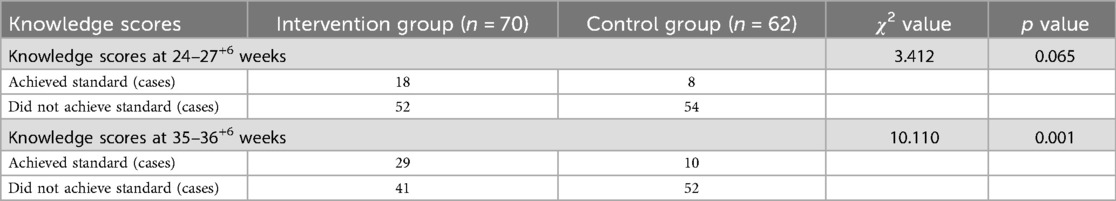 Moreover, studies have shown that pregnant women's knowledge of health is closely associated with antenatal compliance and maternal–infant outcomes. In a community-based study in China, Wang et al. (37) found that women who received structured prenatal health education had better outcomes in weight control, delivery method selection, and breastfeeding rates compared to those who received routine education. Their study emphasized that contextualization and interactivity in knowledge delivery are key to improving intervention outcomes. Similarly, the intervention in the present study employed modular education, regular health content dissemination via WeChat groups, and personalized Q&A support, which together contributed to the sustainability and individualization of knowledge acquisition, reinforcing both memory retention and behavioral identification among participants.