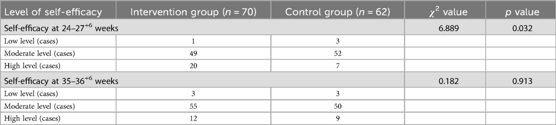 In this study, the physical activity self-efficacy of pregnant women in the intervention group was significantly higher than in the control group during the second trimester (p = 0.032), however, this difference was no longer statistically significant by the third trimester. Before the intervention, most participants had moderate levels of physical activity self-efficacy. Post-intervention results indicated that the intervention significantly improved physical activity self-efficacy during the second trimester, particularly increasing the likelihood of achieving higher self-efficacy levels.