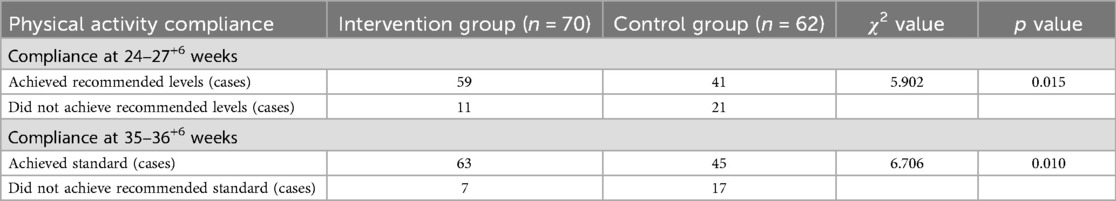 To further assess the efficacy of a physical activity intervention grounded in FBM for actual physical activity performance among overweight or obese women prior to pregnancy, this study compared physical activity compliance between the intervention and control groups during the second and third trimesters. The results are presented in Table 6. In the second trimester (24–27+6 weeks), 59 participants in the intervention group (84.3%) met the recommended level of physical activity, while 11 (15.7%) did not. In the control group, 41 participants (66.1%) met the standard, and 21 (33.9%) did not. Statistical analysis showed a significant difference between the groups (χ2 = 5.902, p = 0.015), indicating that the physical activity performance of the intervention group was superior to that of the control group at this stage, and that the intervention had a preliminary positive effect. In the third trimester (35–36+6 weeks), the number of participants in the intervention group meeting the physical activity standard increased to 63 (90.0%), with only 7 (10.0%) not meeting the standard. In the control group, 45 participants (72.6%) met the standard, while 17 (27.4%) did not. The difference between groups remained statistically significant (χ2 = 6.706, p = 0.010), suggesting that under continuous intervention, the physical activity compliance rate of the intervention group further improved, and the effect of the intervention remained significant in late pregnancy. These findings indicate that the FBM-based intervention significantly improved physical activity compliance in both the second and third trimesters among overweight or obese pregnant women. This demonstrates the model's practical value and effectiveness in promoting the translation of target behaviors into action.