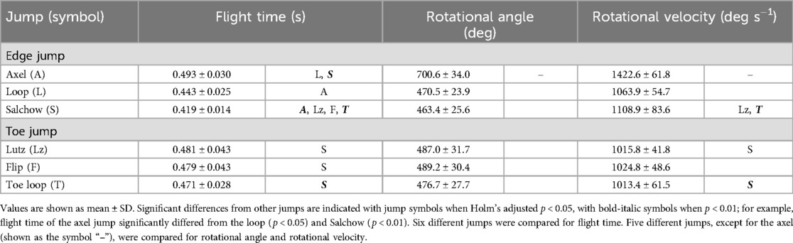 Table 2 lists the basic jump parameters. For the flight time, comparisons of six different jumps showed significant differences between the axel and Salchow from the others (p = 0.004–0.039; all p-values were adjusted by Holm's method). For the rotational angle, comparisons of five different jumps, except for the axel, showed no significant differences between all jumps (p > 0.677). For the rotational velocity, comparisons of five different jumps, except for the axel, showed significant differences between the Salchow and the others (p = 0.005–0.049).