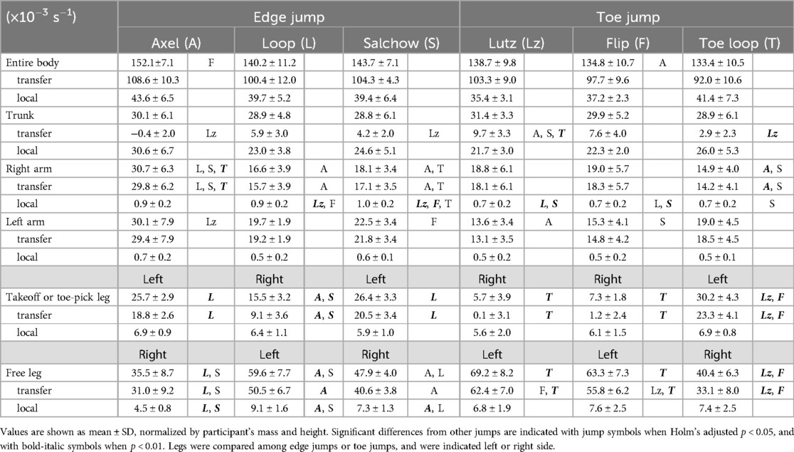 Comparisons between the three different edge or toe jumps showed significant differences in the angular momenta of the takeoff and toe-pick legs between jumps (p < 0.002; p > 0.246 for the other comparisons). A similar trend was observed for transfer terms (p < 0.002). No significant differences were found in either local term (p > 0.176).