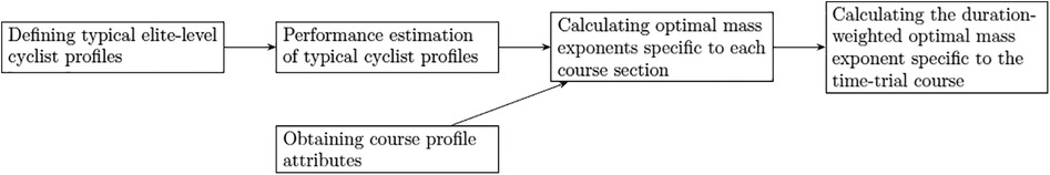 This study presents a novel numerical approach for deriving the optimal body mass exponent in the power-to-mass ratio for performance prediction, determined by the primary resistive forces acting on a cyclist. The approach utilized the power-duration relationship to estimate time-trial performance across five typical elite-level road cyclist profiles, constructed using previously published normative data, over both simplified hypothetical and complex real-world time-trial courses. A schematic overview of the method is presented in Figure 1, and the following subsections describe each step in detail.