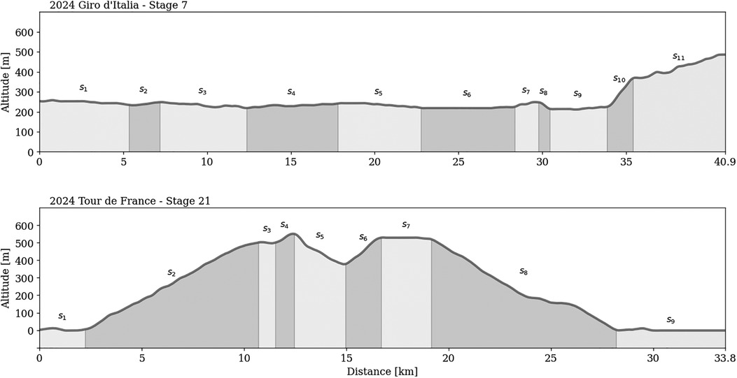 To simplify time-trial performance estimations on these real-world courses, we assumed two-dimensional time-trial courses in a vertical plane, consistent with the methods used in previous studies (18–21). Course profiles were parsed using a custom-made algorithm implemented in Python v3.12.5. This process involved the identification of surface points, i.e., course coordinates, extracted from two-dimensional course profile schematics obtained online (22). The extracted coordinates were interpolated using cubic spline interpolation and filtered using a Savitzky-Golay filter, to generate the virtual course profile models used in the further analyses (23, 24). Each course profile was then divided into distinct sections concerning terrain profile (i.e., flat, uphill, and downhill sections). This process resulted in 11 and 9 sections for the Giro d’Italia and the Tour de France stages, respectively (Figure 2). Section boundaries were defined at points where substantial changes in the course inclination occurred, and attributes for each section, such as distance and elevation gain, were extracted. The duration () required to complete each section of the course was determined using the estimated mean speed of each typical cyclist profile over the specific section, based on Equation 4, and assuming an estimated constant mean power output across the entire course. The total finishing time was calculated as the sum of section durations.