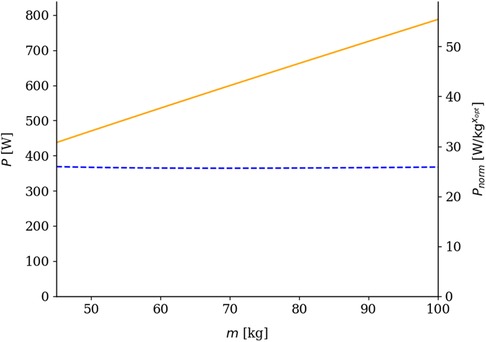 Figure 3. Illustration of the derived absolute power output () as a function of body mass () (orange solid curve), and its transformation into the derived power-to-mass ratio () (blue dashed curve). Values are shown across a body mass range of 45–100 kg, assuming constant speed ( m/s) and incline (). The derived metric () demonstrates approximate body mass independence across the studied range.