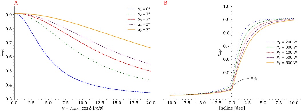 Further analyses revealed that the curvature of the optimal mass exponent curve decreases as the incline increases, demonstrating that increases with steeper uphill gradients. In contrast, a higher headwind velocity relative to the cyclist () results in a lower (Figure 4A). A general pattern was also observed whereby higher-performing cyclists, that reach greater velocities due to a higher power output, exhibit lower values at a given incline. This suggests that the performance-predictive ability of mass-normalized power output (i.e., W/kg) is inversely related to performance level. As shown in Figure 4B, if curves for different constant power outputs are assumed to represent different performance levels, then drag area normalized power output becomes relatively more important at higher performance levels due to increased effective headwind. However, this effect remains relatively small.