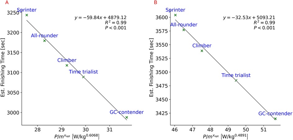 Based on Equation 8, the calculated values for the analysed Giro d’Italia and Tour de France ITT courses were 0.4891 (95% CI: 0.4767–0.5015) and 0.6068 (95% CI: 0.5799–0.6337), respectively. These values correspond to optimal exponents expected for cycling on constant inclines of 0.44 and 1.16, respectively, based on the mean estimated average speeds of typical cyclist profiles over the respective courses under no-wind conditions (Tables 3, 4). Using the defined duration-weighted optimal mass exponents, linear regression analyses effectively captured variations in estimated total finishing times, demonstrating a robust ability to predict performance outcomes over the investigated time-trial courses (Figure 5).