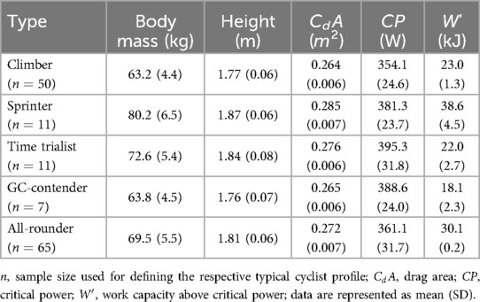 Table 1. Morphological characteristics and critical power model parameters—critical power () and curvature constant ()—for the defined typical cyclist profiles. Morphological data were obtained from Valenzuela et al. (10), while and values were derived from the reported power data using Equation 1. Mean values of these parameters were used in time-trial performance estimations for each model.