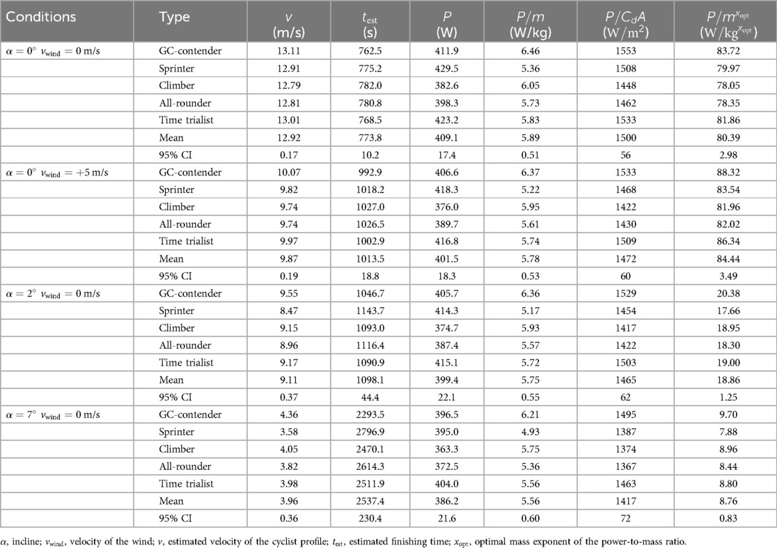 Table 2. Estimated average speed, finishing time and average power output of typical cyclist profiles over 10 km hypothetical courses with constant incline under varying wind conditions. Optimal mass exponents of the power-to-mass ratio (), based on mean estimated average speed across typical cyclist profiles, were determined as follows: 0.3834 for a flat course () with no wind, 0.3674 for a flat course () with a +5 m/s headwind (), 0.7197 for a moderate incline () with no wind, and 0.8929 for a steep incline () with no wind.