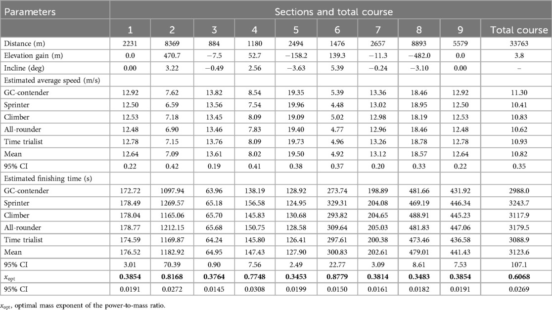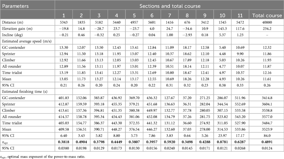 Table 4. Terrain profile, estimated average speeds, and finishing times of typical cyclist profiles across the identified sections of stage 7 of the 2024 Giro d’Italia. Optimal mass exponents of the power-to-mass ratio () were calculated for each section, and the course-specific, duration-weighted mass exponent () was 0.4891.