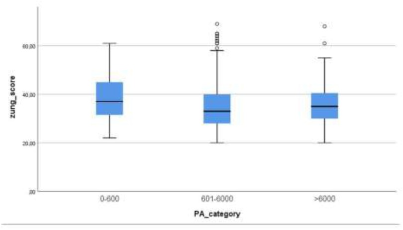 The mean Zung anxiety scale score for the group with 601–6,000 MET-minutes/week was 34.65 ± 8.24, while the mean Zung anxiety scale score for the group >6,000 MET-minutes/week was 36.61 ± 9.59. The mean scores in the examined groups are presented in Figure 1.