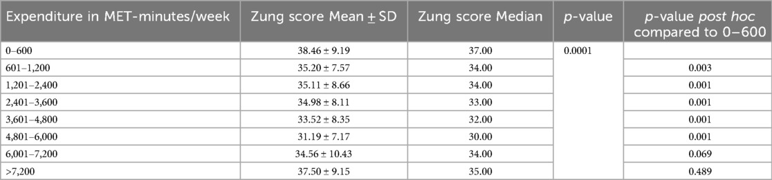 The mean and median Zung anxiety scale scores were the lowest in the group with an energy expenditure of 4,801–6,000 MET-minutes per week. There were no significant differences between the scores on the Zung anxiety scale between the group with the lowest energy expenditure and the groups with 6,001–7,200 MET-minutes/week and with >7,200 MET-minutes/week. The mean and median scores for each energy expenditure category are presented in Table 1.