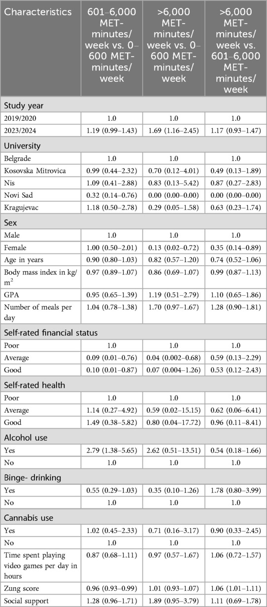 Regarding study year and university, participants from 2023 study group were more likely to be in >6,000 MET-minutes per week of PA than 0–600 MET-minutes per week of PA and studying in Novi Sad was negatively associated with 601–6,000 MET-minutes per week of PA when compared to less than 600 MET-minutes per week of PA. To our knowledge, there is insufficient evidence to compare our findings on disparities in PA levels between different universities in Serbia. Conversely, the observation that participants from the 2023 group had a higher likelihood of engaging in over 6,000 MET-minutes per week of PA compared to those with 0 to 600 MET MET-minutes per week of PA contradicts evidence suggesting that, in recent decades, physical activity levels among the general population, including young adults, have steadily declined (32).