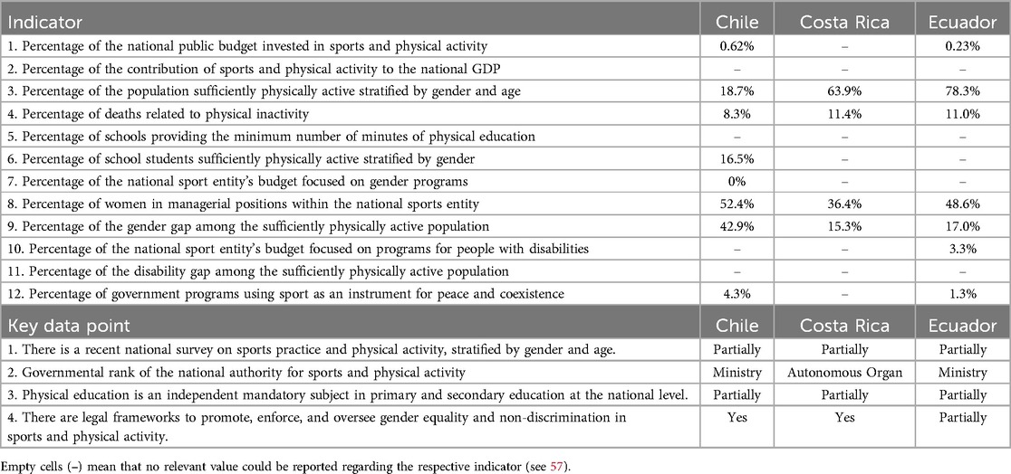 Regarding the first key data point (recent national survey on sports practice and physical activity), all three countries were able to partially comply with its requirements, considering some limitations. That is, for all countries, the surveys are not representative of key age groups (under 18, 18–64, and over 65 years old), and its methodology, microdata, and basic tabulations are not publicly accessible. Additionally, for Costa Rica and Chile, the reference survey is over five years old (43, 44, 54–56).