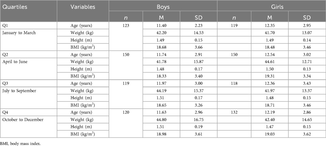 A total of 1,031 children and adolescents (512 boys and 519 girls, aged 12.02 ± 2.95 years) were included in the investigation. Four hundred sixty-nine (45.5%; 230 boys and 239 girls) did not participate in sports on a regular basis. Participants involved in individual sports were 291 (28.2%; 117 boys and 174 girls), while those engaged in team sports were 271 (26.3%; 165 boys and 106 girls). Participants were also stratified into age groups and subdivided according to their birth quartiles (Q1: January–March, Q2: April–June, Q3: July–September, Q4: October–December) to examine the RAE (Table 1 for further details).