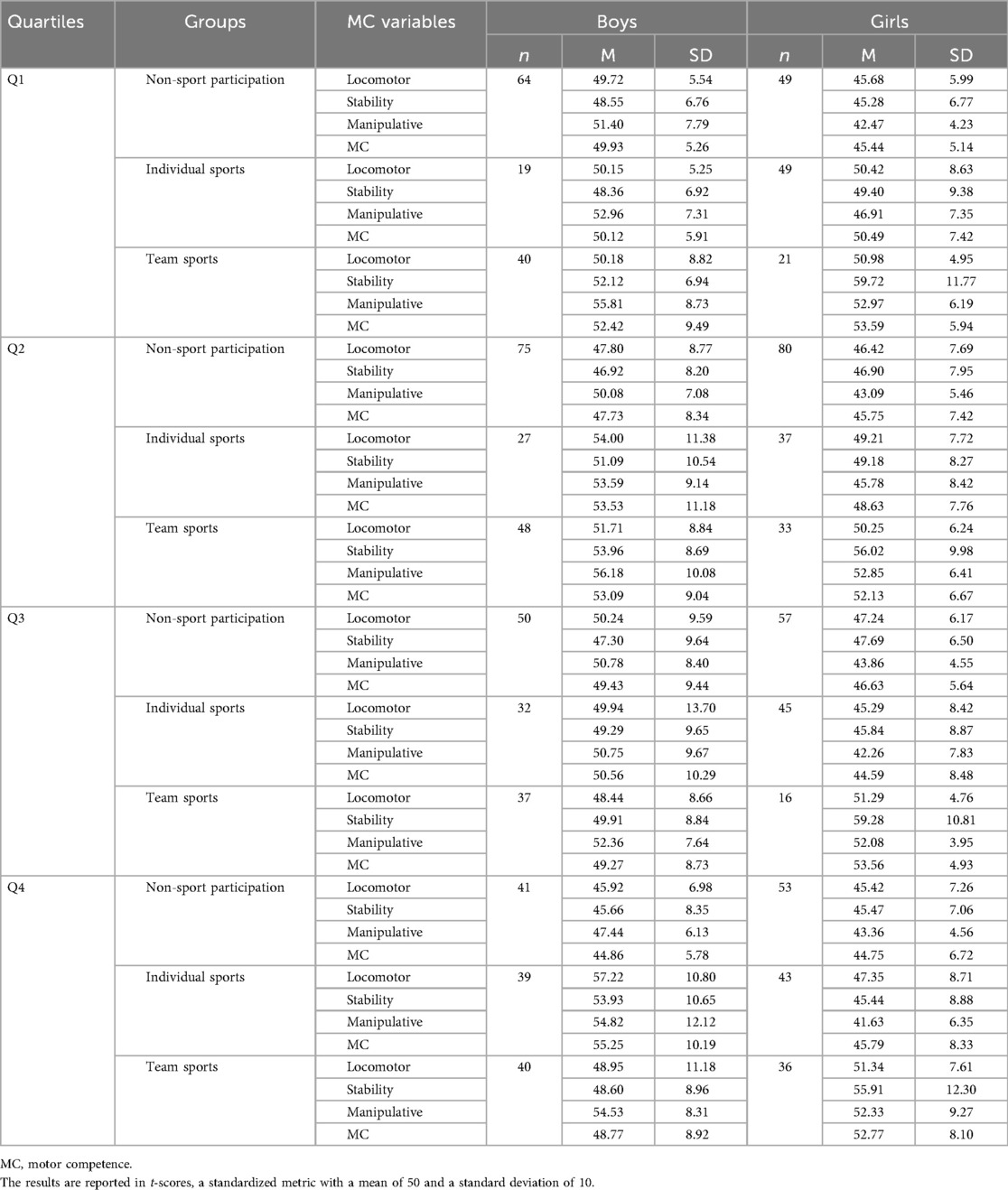 A combination of descriptive, inferential, and multivariate analyses was performed. Descriptive statistics were calculated to characterize the variables, including means and standard deviations. The Kolmogorov–Smirnov test was employed to assess data normality, and the Levene test confirmed the assumption of homogeneity of variances (p > 0.05) (34). To explore differences in MC and its components across birth quartiles, sex, and sports participation, inferential analyses were conducted using one-way ANOVA. post-hoc Tukey's tests were performed for pairwise comparisons where significant group differences were identified. A three-way MANCOVA was conducted to examine the effects of birth quartile, sports participation, and sex on Locomotor, Stability, Manipulative, and MC. Birth quartile (Q1–Q4), sports participation (non-sports participation, individual and team sports), and sex (boys, girls) were included as fixed factors. The full factorial model tested the main effects, two-way interactions (birth quartile × sports participation, birth quartile × sex, sports Participation × sex), and three-way interactions (birth quartile × sports participation × sex). post-hoc Tukey's tests were applied where significant differences were found. Partial eta-squared (η2) values were reported to assess effect sizes. The Statistical Package for the Social Sciences (SPSS, IBM Corporation), version 29.0, was used, adopting an alpha significance level of 5%.